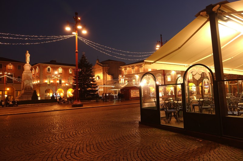 Piazza Saffi at night with the Christmas lights
