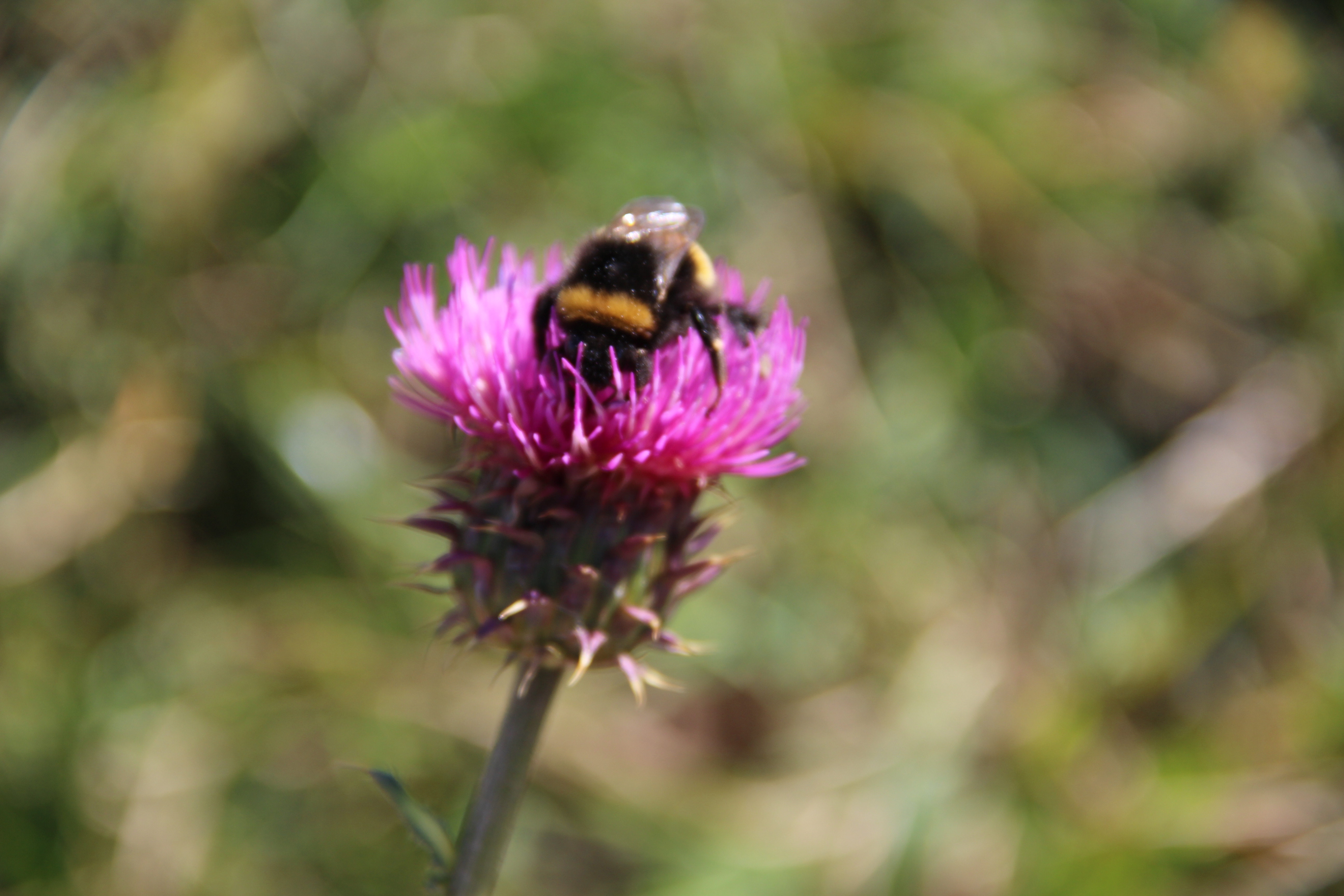 Last time I was there, there were lots of bright blue thistle type things. This time, there were some bright pink ones. The bees seem to like them too!
